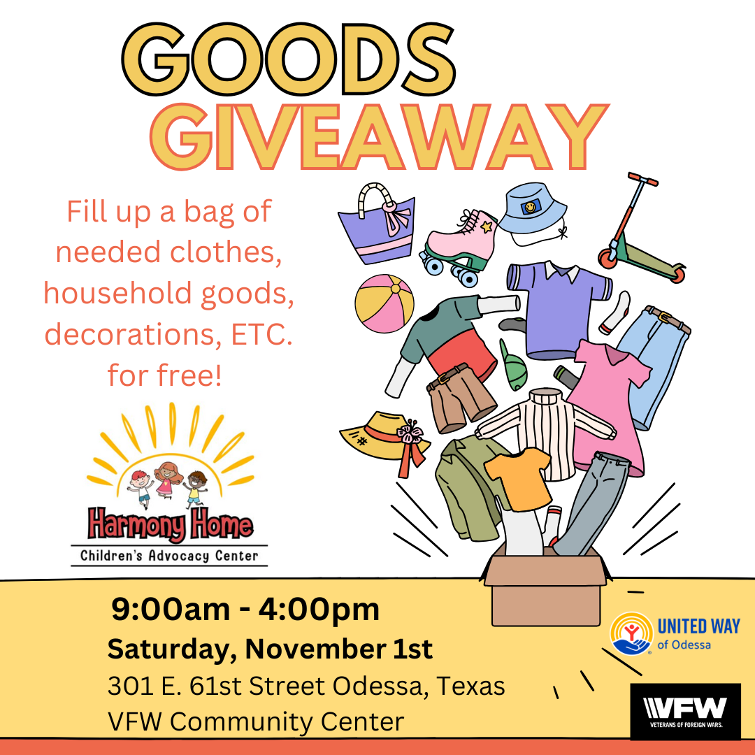 The attached flyer is for Harmony Home's upcoming "Goods Giveaway" on